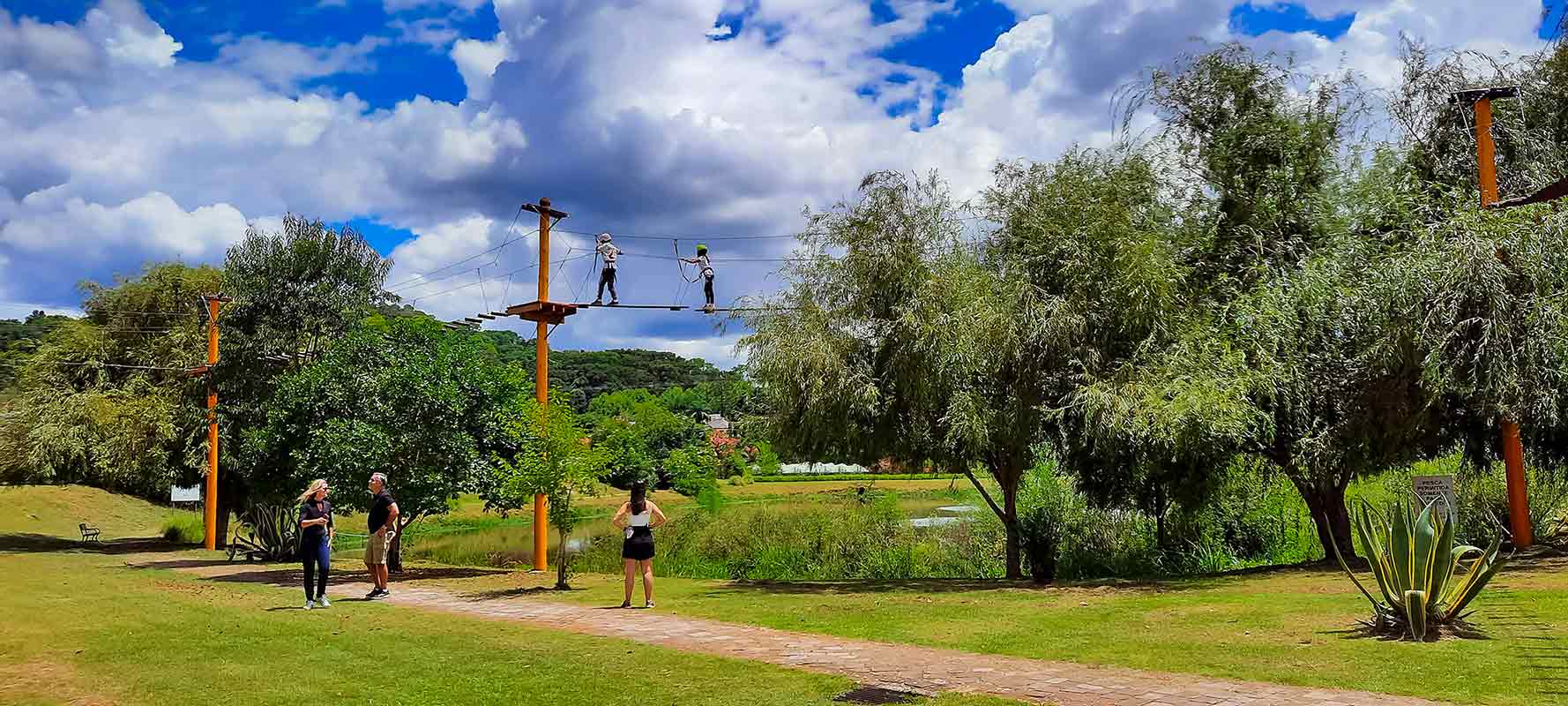 O circuito do arvorismo é composto por 8 obstáculos suspensos entre postes.